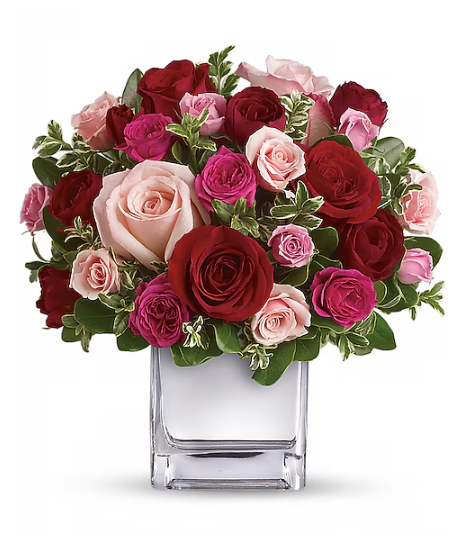 The right bouquet tells your love story better than words. If your partner loves classic romance, Always On My Mind – Long Stemmed Red Roses delivers a dozen stunning red roses that say “I love you” in every petal. For those who adore vibrant colors, Madly in Love with Red Roses mixes lavender, pink, coral, and red roses in a jewel-toned cube vase—perfect for bold, passionate hearts.