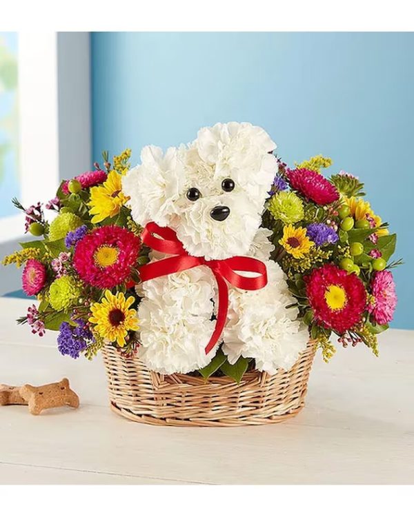 Unleash the smiles with our original pup arrangement! Hand-designed inside a basket, this customer favorite floral creation makes a great gift for pet lovers or anyone who could use a little puppy love in their life.