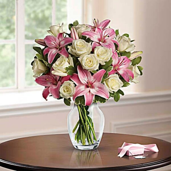 Elegant white roses and sweet pink asiatic lilies are hand-arranged with greens. It’s the perfect way to show you love her always and forever.