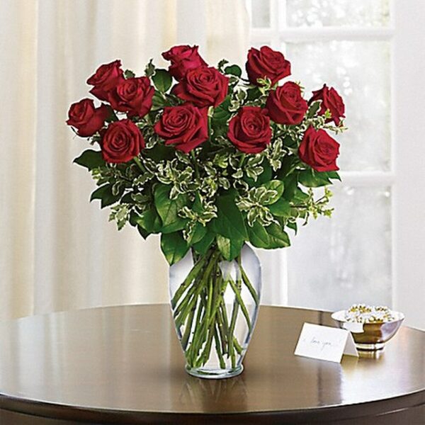 Say “I love you” by sending this lovely arrangement of twelve radiant red roses and fresh greens delivered in a beautiful spring garden vase. Love always.