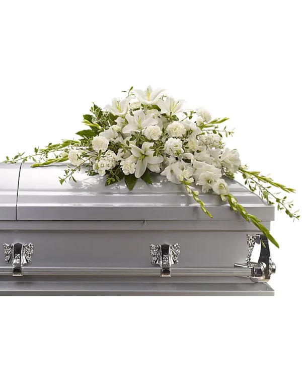 A casket spray made of all white flowers and simple greenery is a simply stunning way to honor the deceased while bringing a quiet strength and serenity to those present.