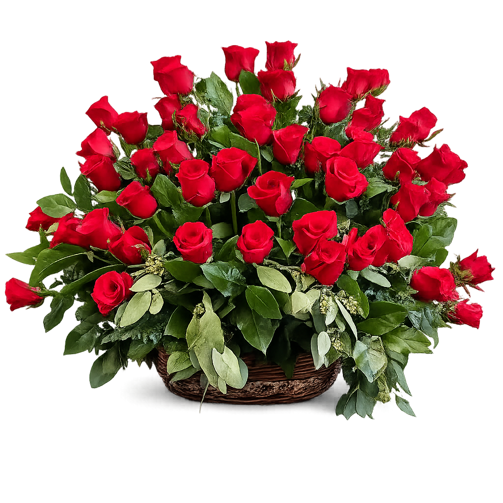 A beautiful, bountiful basket of luminous red roses that feels so fresh, natural, and welcomed in a home or at a service.