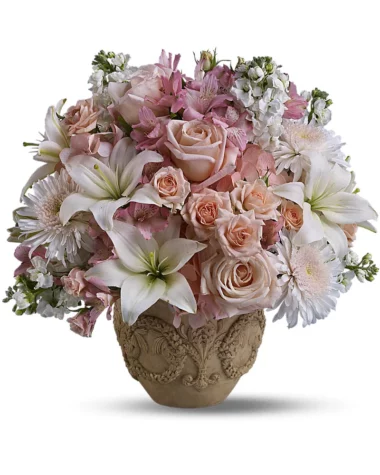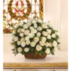 A beautiful, bountiful basket of luminous white roses that feels so fresh, natural, and welcomed in a home or at a service.