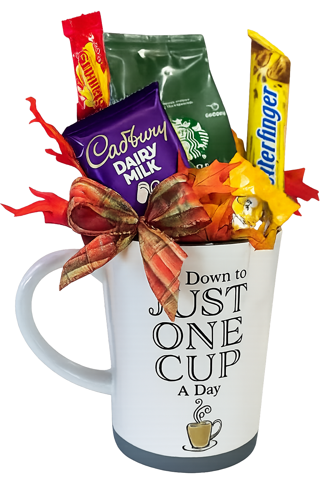 Delight any coffee enthusiast with this beautifully arranged gift mug, thoughtfully curated to offer a perfect blend of comfort and indulgence. Presented in a stylish ceramic mug featuring the playful phrase “Down to Just One Cup a Day,” this gift is both charming and practical. The mug is expertly filled with premium treats, including :