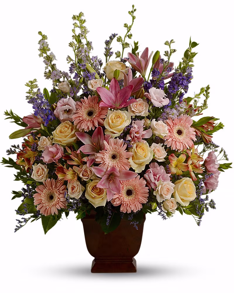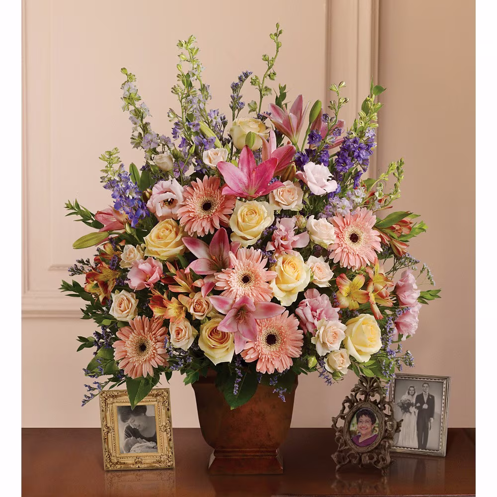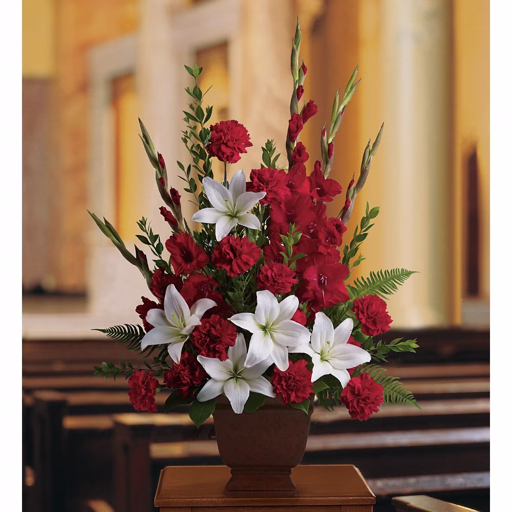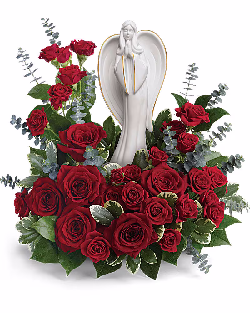 This peaceful porcelain angel sculpture, surrounded by radiant red roses and delicate greenery, is a touching tribute to a rich life.