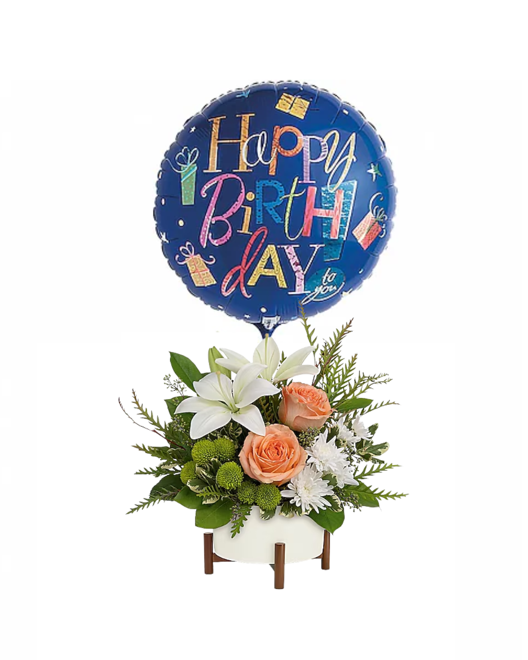 Peach roses, white asiatic lilies, green button spray chrysanthemums and white button spray chrysanthemums are arranged with grevillea, variegated pittosporum, lemon leaf and seeded eucalyptus. Delivered in a Mid-Century planter.