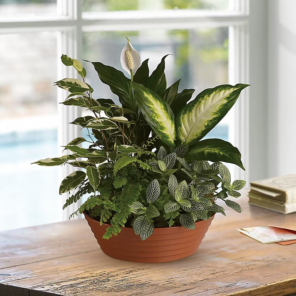 A white hypoestes is joined by green dieffenbachia, spathipyhllum, ficus and Boston fern that’s delivered in a beautiful plastic dish.