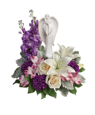 An elegantly unique expression of your deepest condolences, this majestic mix of crème, white and lavender blooms includes fragrant roses and lilies to refresh and rejuvenate their spirits. Nestled among the blooms is a graceful angel sculpture – a serene, spiritual keepsake they’ll always treasure.