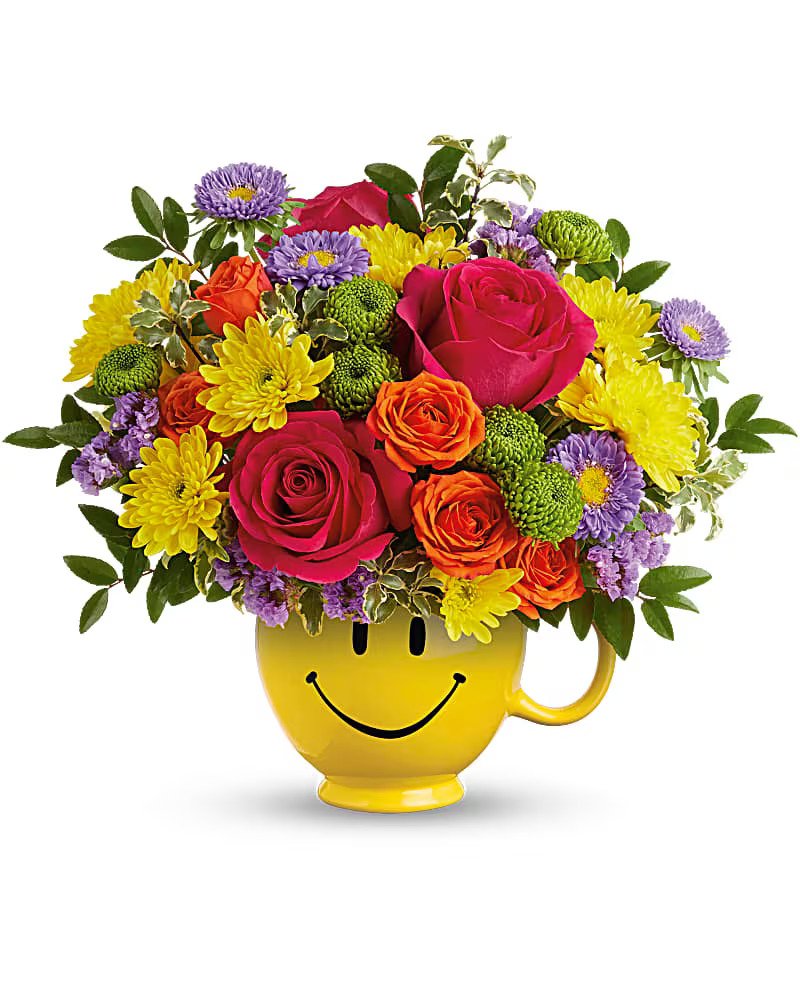 Smile, you’ve got flowers…and a mug! Brighten their day with a burst of colorful roses and a smiling ceramic mug.