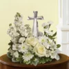 An elegant display of faith and divine peace, this beautiful arrangement will comfort the bereaved in a truly thoughtful and respectful way. An exquisite crystal cross is surrounded by a bed of lovely blossoms. It is sure to be appreciated and always remembered.
