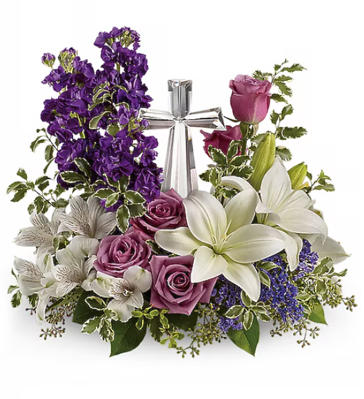 A bouquet to remember. This glorious garden of roses, lilies and alstroemeria surrounds a gleaming Crystal Cross. It’s a radiant, reverent expression of faith that will be appreciated for years to come.