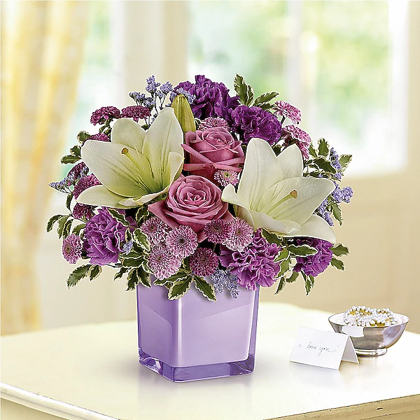 These luxurious lavender roses and crisp white lilies are poised to please! Perfectly presented in a stylish cube vase, it’s an any-occasion surprise they’ll never forget!