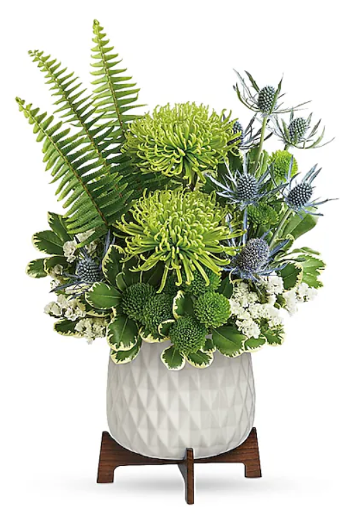 Green spider chrysanthemums, green button spray chrysanthemums, white sinuata statice, and blue eryngium are arranged with sword fern and variegated pittosporum. Delivered in a Mid Mod Geometric Planter.